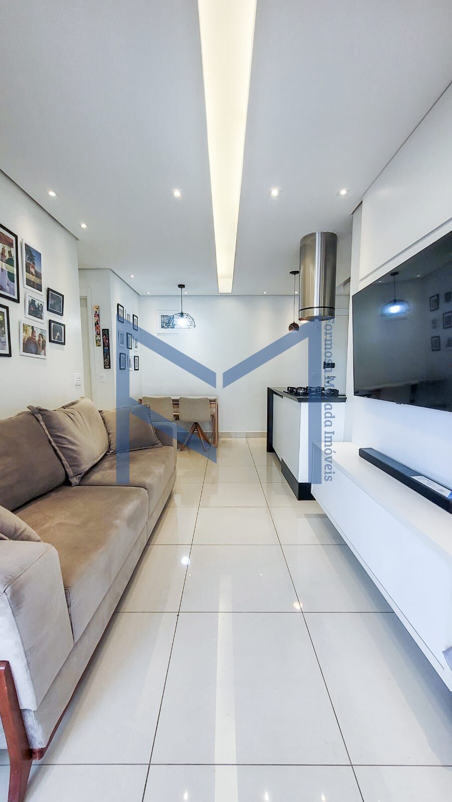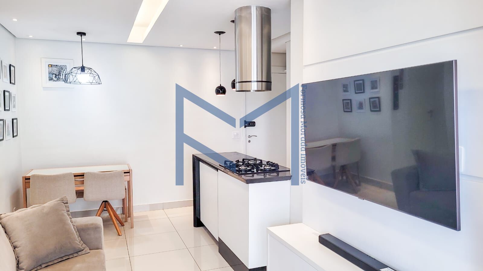 Destaque para cozinha em ilha, e coifa central, que possibilita interação com a sala.