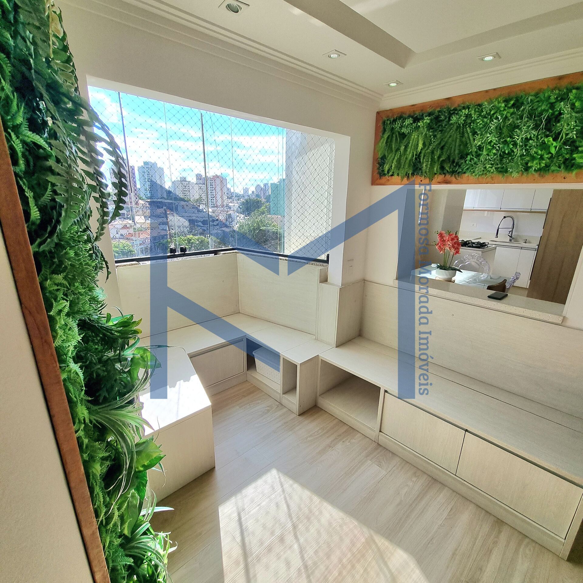Sala com living (sacada integrada), painel de madeira maciça, jardim vertical, canto alemão com gavetas.